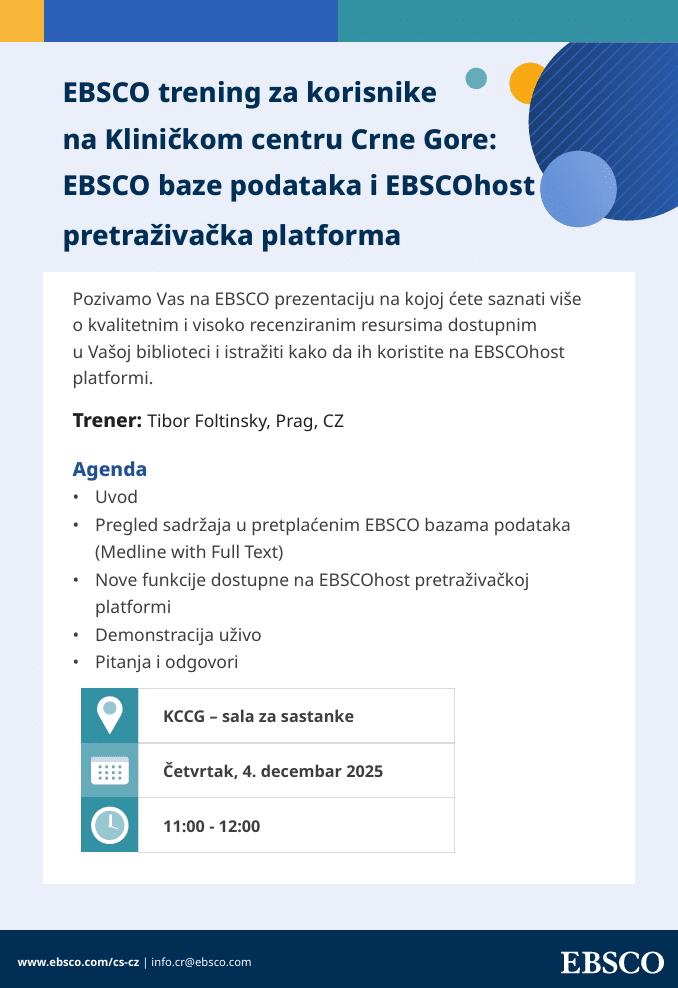 Obavještavamo vas da će EBSCO trener Tibor Foltinski, dana 4. decembra 2025. g, posjetiti Klinički centar Crne Gore. Tom prilikom biće organizovan jednosatni trening o korišćenju EBSCO baza podataka, koji će se održati od 11:00 do 12:00 časova, u sali za sastanke KCCG.