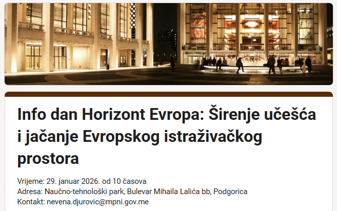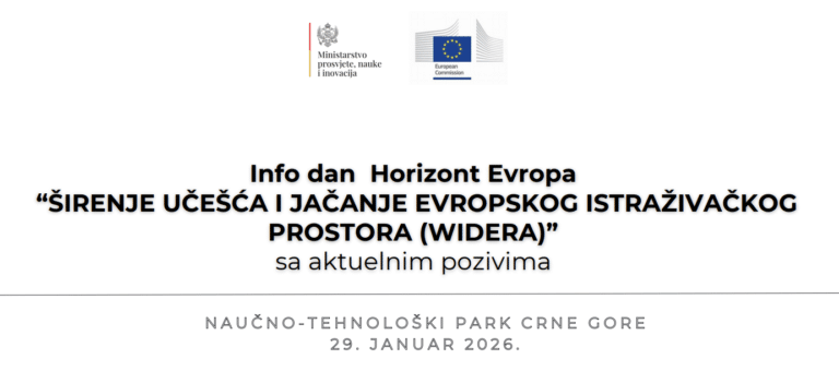 Nacionalna kancelarija za program Horizont Evropa organizuje Info dan za oblast “Širenje učešća i jačanje Evropskog istraživačkog prostora”, koji će se održati u Naučno-tehnološkom parku Crne Gore, u sali MVP, 29. januara 2026. godine, sa početkom u 10 časova.