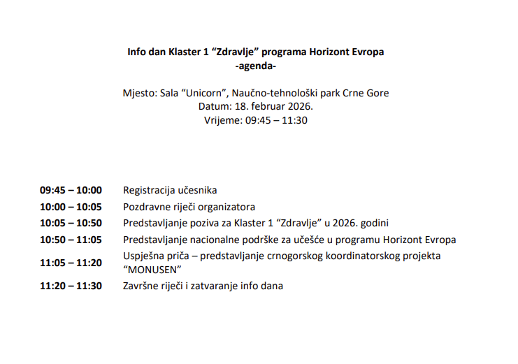 Poštovani/a, Iz Nacionalne kancelarije za program Horizont Evropa Ministarstva prosvjete, nauke i inovacija Crne Gore pozivaju na Horizont Evropa Info dan za Klaster “Zdravlje” - srijeda 18. februara 2026, sa početkom od 10 časova, sala “Unicorn” u Naučno-tehnološkom parku Crne Gore. Na info danu biće prezentovani: Horizont Evropa pozivi iz oblasti zdravlja za 2026. godinu Nacionalna podrška za podsticanje učešća u programu Horizont Evropa “Monusen” - crnogorski koordinatorski HE projekat, čiji je nosilac ETF UCG-a. Projekat je realizovan kroz TWINNING poziv, isti takav poziv je trenutno otvoren, sa rokom prijavedo 9. aprila 2026. Ovaj instrument omogućava organizacijama iz Crne Gore da se povežu sa vodećim evropskim partnerima, kako bi unaprijedili kvalitet istraživanja, internacionalnu vidljivost i kapacitete za buduće projekte.