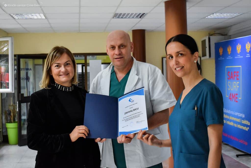 Klinički centar Crne Gore izražava iskrenu zahvalnost kompaniji Novartis na razumijevanju potreba naših pacijenata i podršci naših razvojnih projekata. U to ime direktor IBD-a dr Velibor Majić, u prisustvu načelnice Odleljenja za oftalmologiju IBD-a, dr Nataše Pojužine, uručio je zahvalnicu KCCG-a direktorici kompanije Novartis za Crnu Goru dr Jeleni Stojimirović.